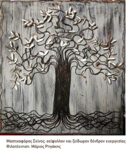 Μια εγχάρακτη δημιουργία που αναπαριστά ένα σχίνο από ευγενή μέταλλα, φιλοτεχνημένο από το Μάριο Ρηγάκη ήταν το δώρο της Περιφερειακής Ενότητας στο ζεύγος Κτιστάκη.