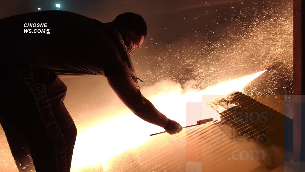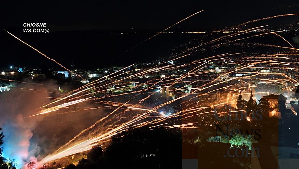 Το «Χριστός Ανέστη» στις ενορίες της Παναγιάς Ερειθιανής και του Αγίου Μάρκου στο Βροντάδο της Χίου, συνοδεύεται από εκατοντάδες ρουκέτες που αυλακώνουν τον ανοιξιάτικο ουρανό.